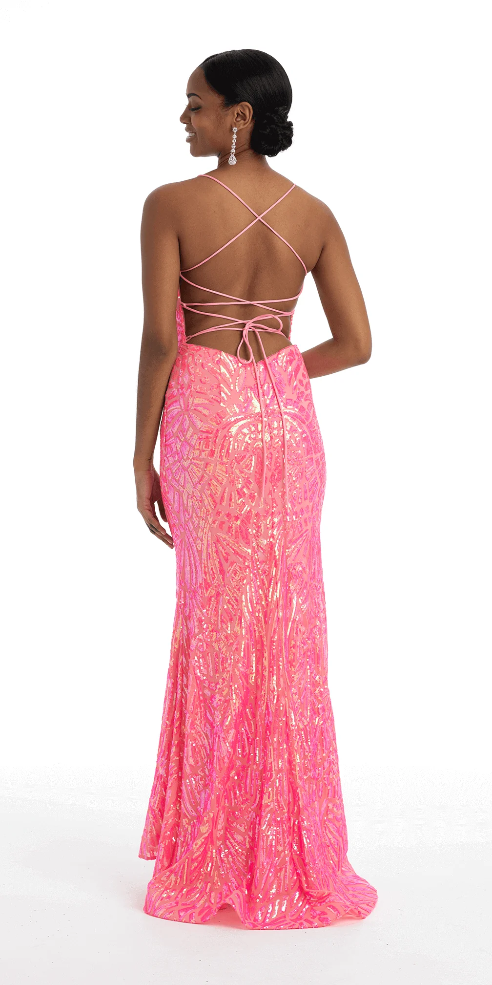 This Bright-Pink Abstract Sequin Lace Up Back Trumpet Dress features a sweetheart neckline, fitted sequin bodice, trumpet silhouette, and lace up back. All eyes on you in this gorgeous pop of pink. The perfect style for prom, a gala, or evening event! Accessorize with silver heels and rhinestone earrings to complete the look.