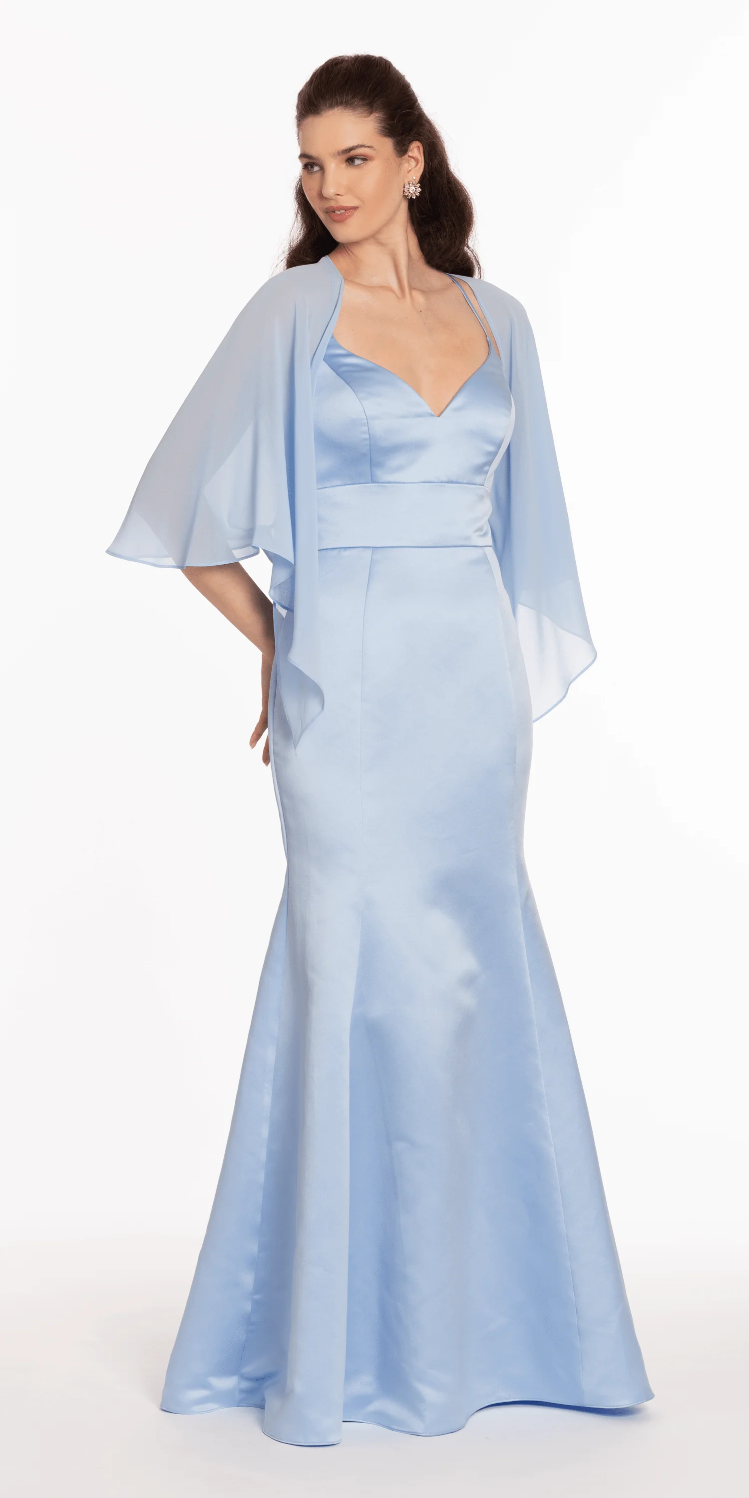 Fashionable for formal events or over a bridesmaid dress. We offer this chiffon cape in black, ivory, light blue, light pink and navy. This dressy separate can be converted into a shrug. Pair it with silver or gold heels, straight drop earrings, and a small clutch to complete the look.