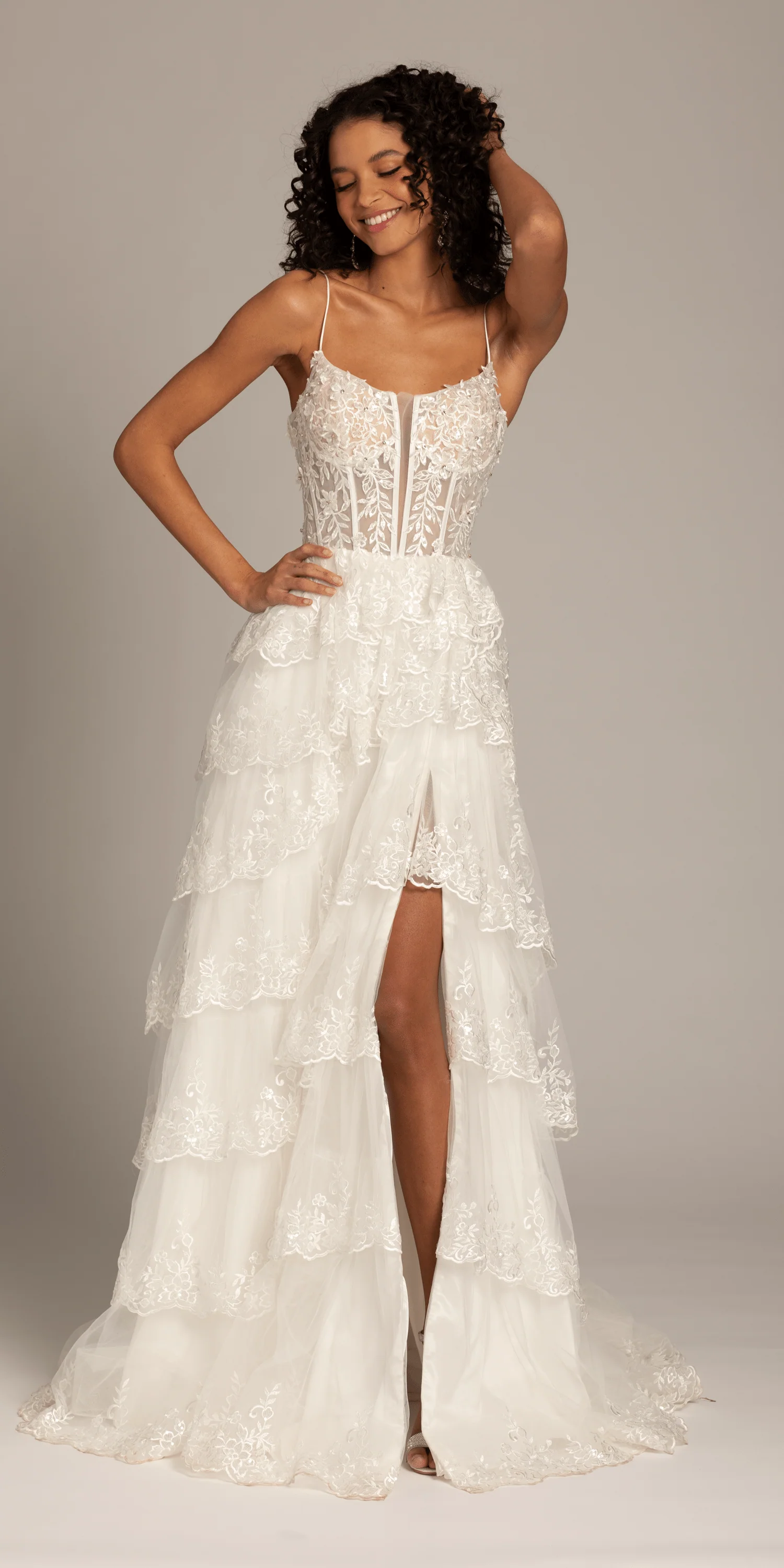 Look absolutely beautiful in this enchanting Ivory Embellished Corset Tiered Tulle Dress with Side Slit! Show off your shape with a corset top that will have everyone wanting to take a second look. The tiers of tulle create a look fit for a queen, and the side slit adds an alluring touch to your dream wedding dress. Complement this style with our bridesmaid collection.