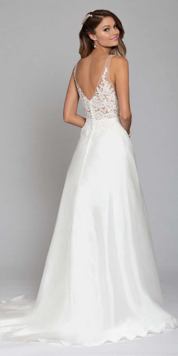 Own your walk down the aisle in this gorgeous Ivory A-line wedding dress! With its plunging neckline, floral appliqué bodice, and illusion back, this wedding gown is as elegant and timeless as they come. Pair it with trendy emerald bridesmaid dresses and an appliqué flower girl dress to match.