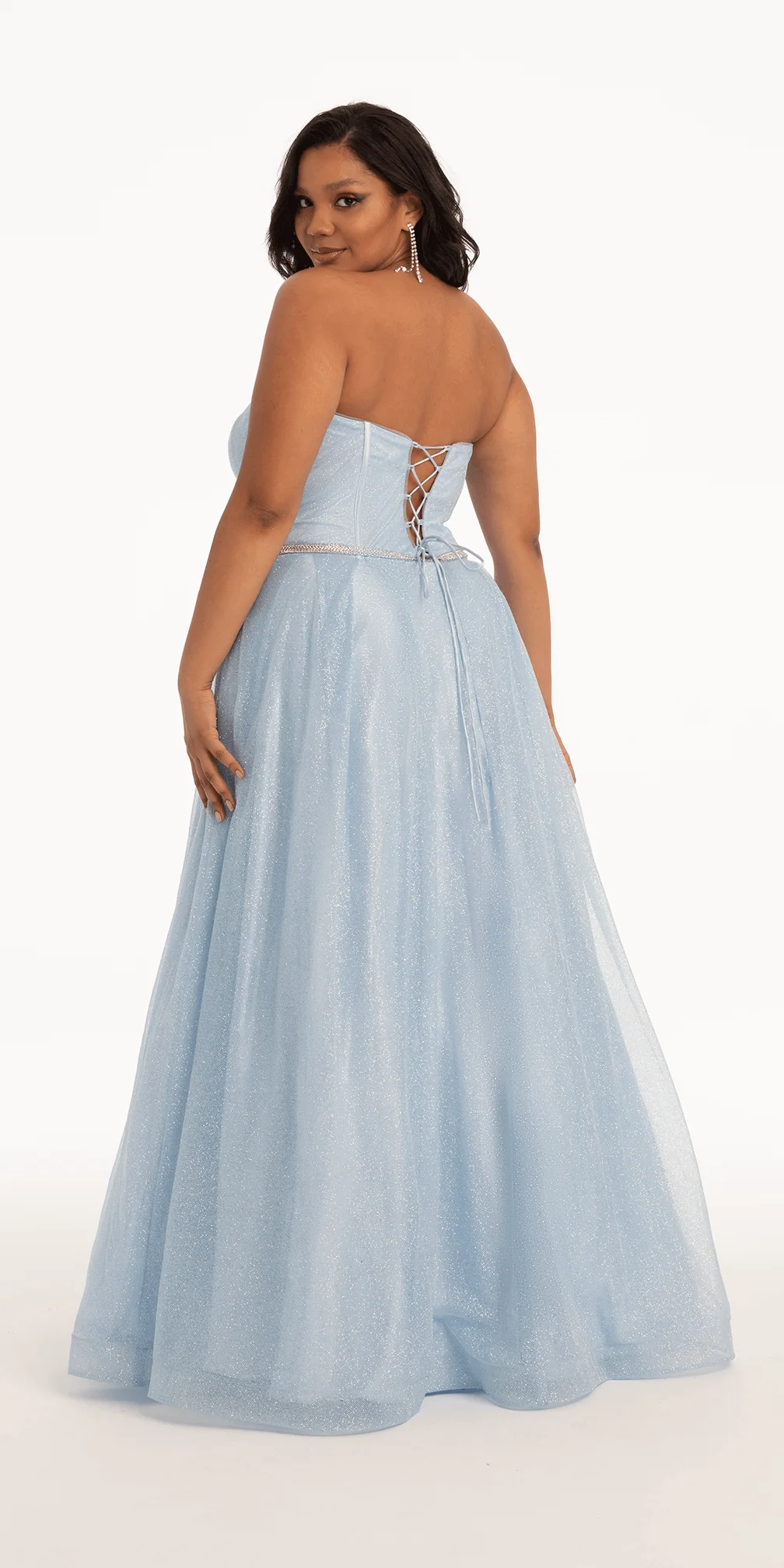 Want to look and feel like a Disney princess? This prom dress is your fashion ticket! With its strapless neckline, fitted bodice with beautiful crystal waistband, and ballgown silhouette, this light-blue evening dress, offered in plus sizes, is ready to make a grand entrance. Wear this style to prom as well! Add on silver accessories to complete the look.