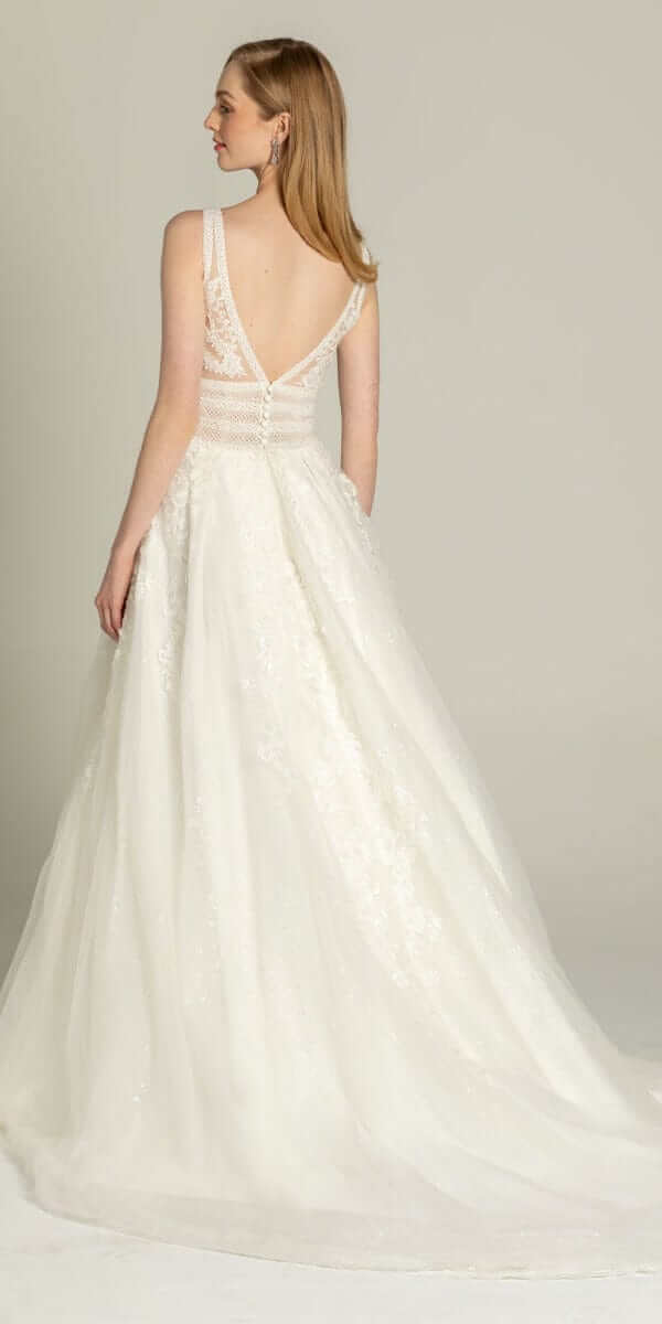 Look and feel like a queen on your wedding day in this beautiful ballgown wedding dress! This bridal ivory gown features a plunge neckline, fitted beaded bodice, box pleated ballgown silhouette, v-back, and tulle fabric. The combination of glitter and pleats catches the light with every step. The definition of picture-perfect from every angle.