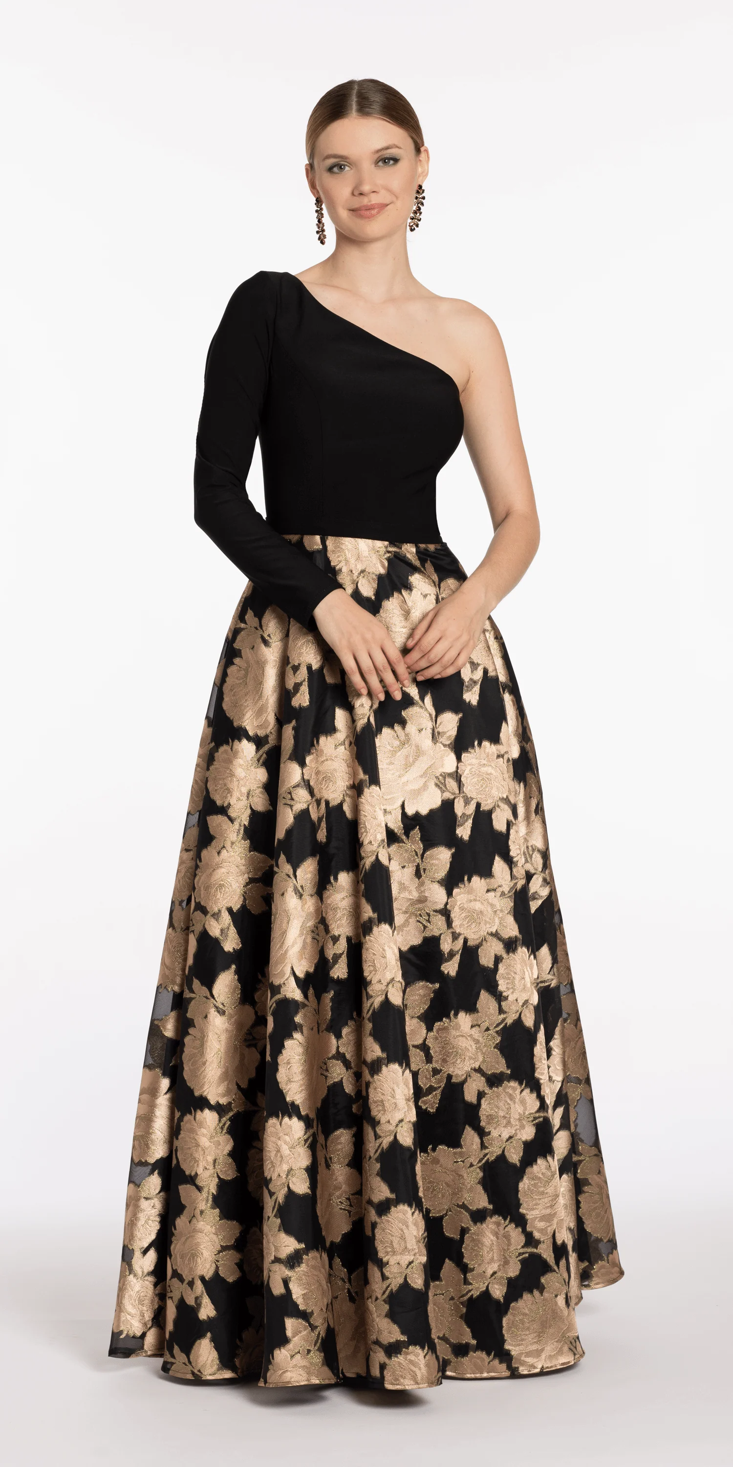 Truly unique, this black-bronze Jersey Jacquard One Shoulder Long Sleeve Ballgown with Pockets is figure-flattering as it is beautiful. With one long sleeve this ballgown silhouette is crafted with luxurious jersey fabric from the asymmetrical neckline to the waist and the floral jacquard ballgown skirt with pockets is outlined in glitter to the hemline. Designed to shimmer for a night at the opera, wedding guest, military ball, mother of the bride, a black-tie gala, or red carpet event! Enhance this contemporary look with a Rhinestone Foldover Handbag, Low Heel Glitter Block Sandals, and Triple Leaf Linear Drop Earrings.