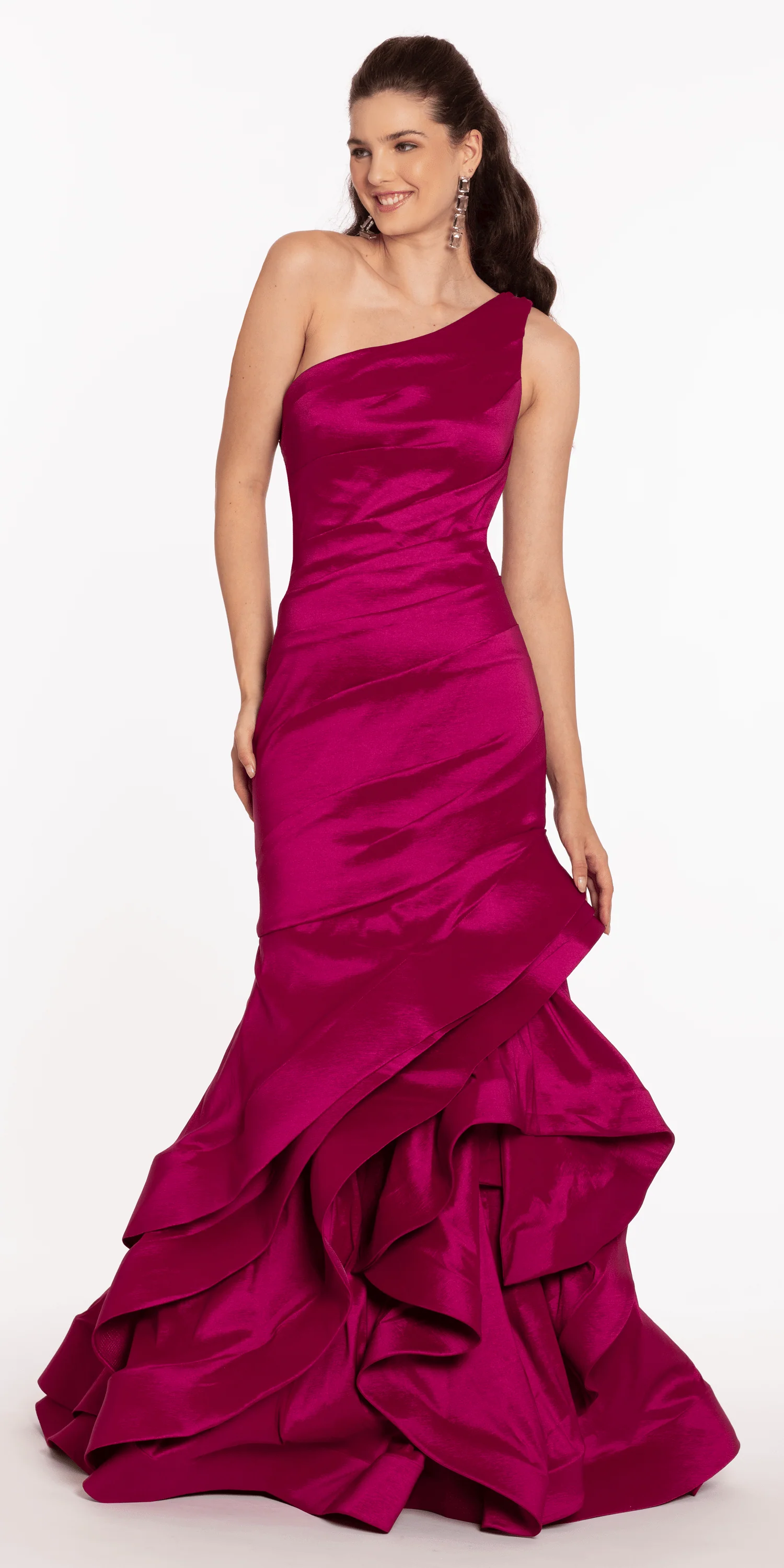 One Shoulder Taffeta Tiered Hem Mermaid Dress