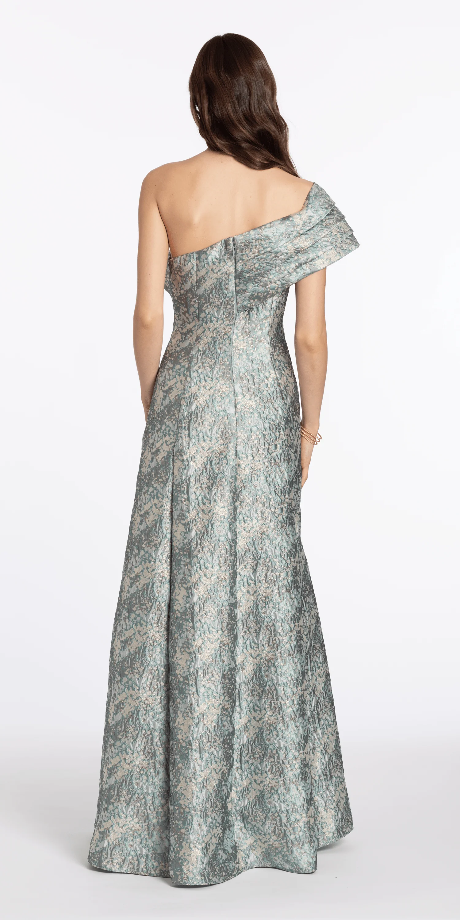 Graceful and effortlessly refined; this sage Pleated One Shoulder Floral Brocade A Line Dress is the perfect choice for the mother of the bride or groom, wedding guest, or warmer weather evening galas. Crafted from rich floral brocade fabric bring texture and depth with every move. This aline silhouette flatters the figure from the pleated one shoulder neckline to the fitted bodice, and to the hem. Accessorize this striking spring style with Satin Rhinestone Strappy High Heel Sandals and Multi Stone Teardrop Earrings.